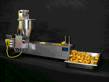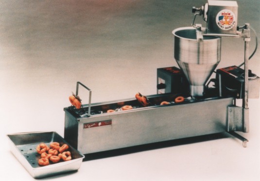 – Der Teigstößel im Trichter formt nun mini Donut um mini Donut und drückt diese, vollautomatisch, in die Backstraße der Donutmaschine.