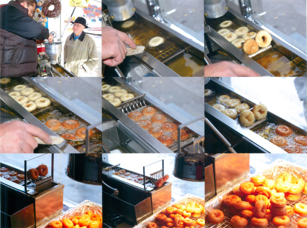 – Sobald die mini Donuts in die Backstraße gefallen sind, werden Sie auf der einen Seite für ca. 20 sec. im schwimmenden Spezialfett* gebacken. Dabei schwimmen die Teigringe, wie von „Geisterhand“ angetrieben, auf den Wender, der sich in der Mitte der Backstraße befindet. Die mini Donuts werden hier automatisch gewendet und nun für ca. weitere 20 sec. von der anderen Seite fertig gebacken.