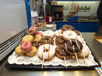 backfrische mini Donuts, wahlweise mit Schoko-, Vanille-, Himbeer-, oder Erdbeersauce, bunten Streuseln, Krokant, Kokosflocken…..